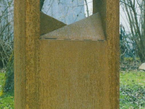 Ein weiterer Künstler, der dafür steht, ist der Grafinger Bildhauer Franz Ferdinand Wörle. Er hat den Umgang mit unterschiedlichen Materialien erlernt und erprobt, so zum Beispiel mit Glas, Keramik und Holz, bevor er in Eisen das Material fand, in dem er seine Vorstellungen am überzeugendsten verwirklichen konnte. Sein Thema sind die strengen, geradlinigen, disziplinierten Skulpturen, denen er Bezeichnungen wie „Tor“, „Stele“ oder „Kasbah“ – Schutzhaus im nordafrikanischen Raum – mitgibt. Und davon finden Sie nicht nur in dieser Ausstellung in jedem Stockwerk einige, sondern auch seit der Eröffnung der Galerie im Jahr 1994 das „Tor II“, draußen vor dem Haus. Diese Stele hat nun bereits 32 Jahre das Galerie-Geschehen miterlebt und von Beginn an das äußere Erscheinungsbild der Galerie mitgeprägt. Wörle gestaltet innerhalb seines vorsätzlich eng gefassten Formenvorrats immer wieder neu, keine Form ist der anderen gleich. Auch wenn Skulpturen paarweise zusammengehören, so unterscheiden sie sich doch voneinander, jede besitzt ihre eigen Individualität. Und der Künstler lässt seine Werke mit Bedacht altern. Denn das ist der zweite Aspekt in seinen Arbeiten: das er seine zeitlos schlichten Arbeiten mit einer die Zeit sichtbar machenden Oberfläche versieht. So wird bei Wörle die fortschreitende Veränderung und schließlich auch Vergänglichkeit zum Thema seines Werkes. Seine Tore, Stelen und seine Kasbahs sind zu verstehen als Zeichen des Lebens und des Todes, Symbole der Ewigkeit.