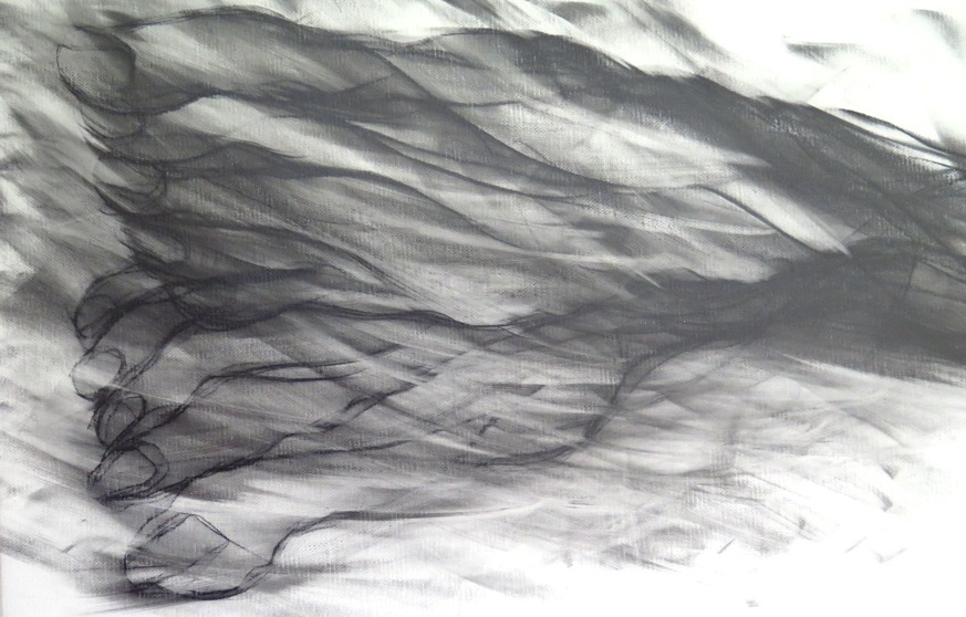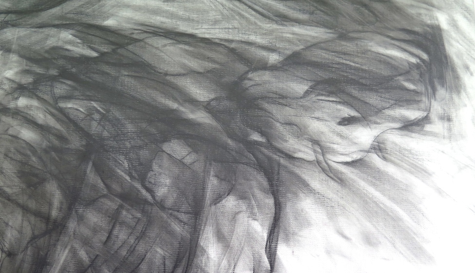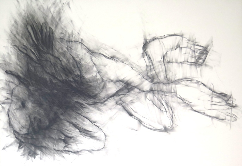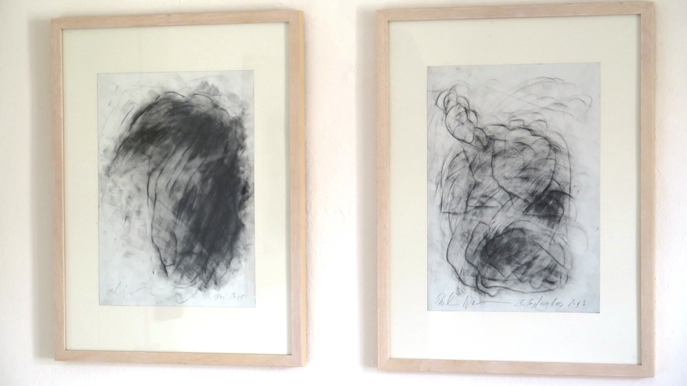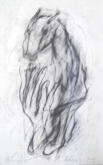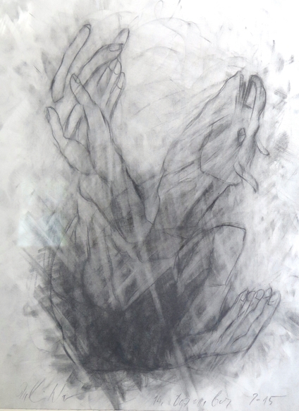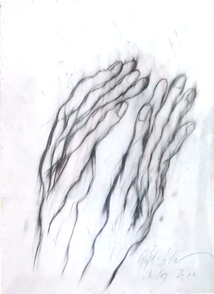 Die Mehrfachkonturierung der Linien funktioniert erst einmal wie eine Unschärfe-Fotografie und löst beim Betrachter in seiner Orientierungssuche eine virtuelle Bewegung aus - damit Aufmerksamkeit für ein so dramatisches wie archaisches Geschehen: der Geburt eines Wesens aus dem Geist der Zeichnungen. Die Hände auf diesen Blättern erfassen ein Gespinst und sind es selber. Es wird gewissermaßen ein altes künstlerisches Genom unserer Existenz aufgerufen, eine Art von Existenzabdruck also von einem verborgenen fremden Wesen, das wir zwar selber sind, das aber vom